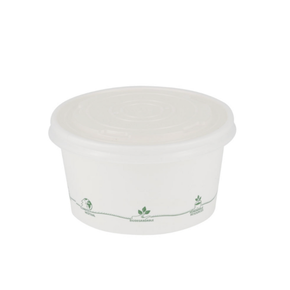 Boluri biodegradabile universale, Ø 115 mm, carton cu captuseala PLA, pt. 300 ml (450ml total), albe, imprimate cu sigle eco, set 25 buc